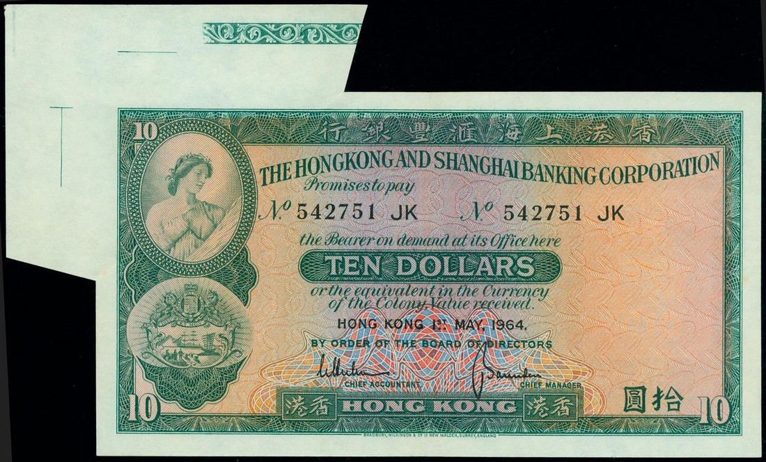 Hong Kong and Shanghai Banking Corporation, $10, 1 May 1964, serial number 542751 JK, green and pink, maiden and coat of arms at left, reverse green, bank building at centre. Error note with a large 'shark fin' at top left corner