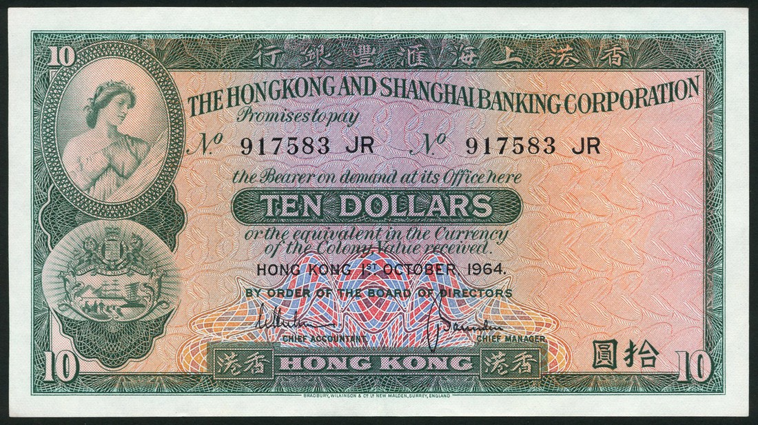 Hong Kong and Shanghai Banking Corporation, $10, 1 October 1964, serial number 917583 JR, green and pale orange and lilac, Ceres and arms at left