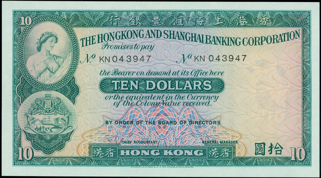 Hong Kong and Shanghai Banking Corporation, $10, an error note without the date or signatures although the prefix would indicate the note to be printed in 1965, serial number KN 043947, green and pink, maiden and coat of arms at left, reverse green, bank building at centre,