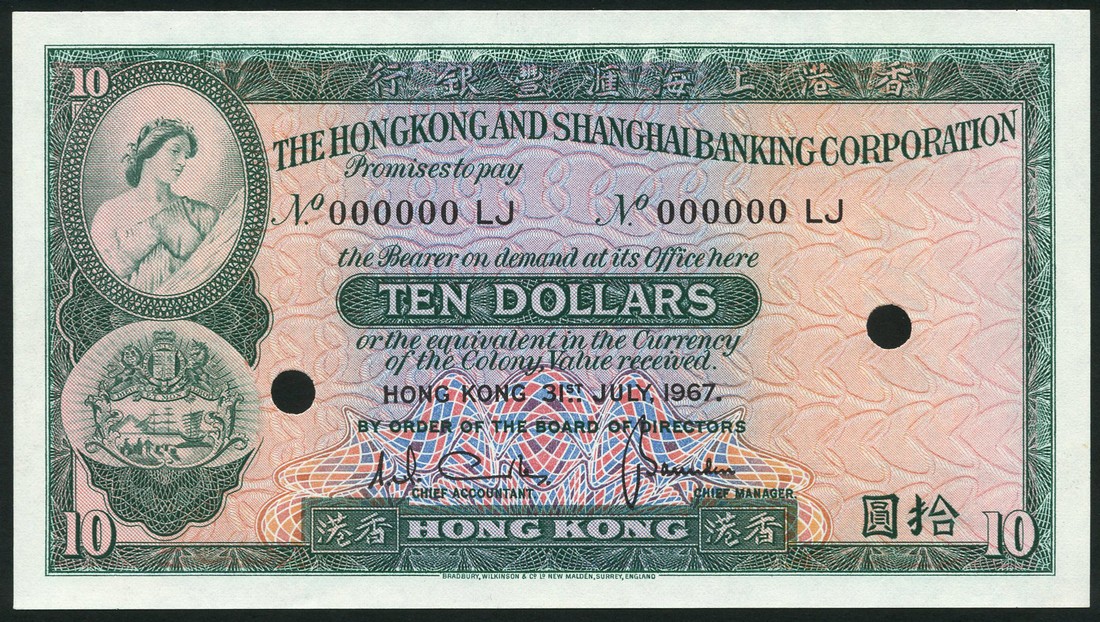 Hong Kong and Shanghai Banking Corporation, specimen $10, 31 July 1967, serial number 000000 LJ, green and pink and pale blue and lilac, Ceres top left, arms of the bank low left, two printed signatures below, reverse green and multicoloured, the bank head office at centre with an angel and trumpet above, value at left and right