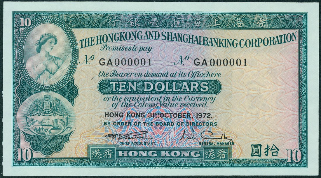 Hong Kong and Shanghai Banking Corporation, $10, 31 Oct 1972, serial number 10000000 TZ and GA 000001, green and multicoloured, maiden( Ceres ) and arms at left, two printed signatures below, reverse green, bank building at centre, angel above