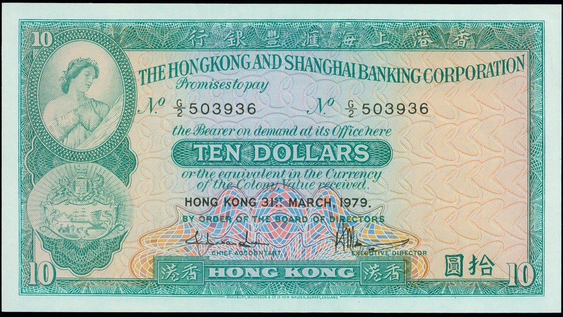 Hong Kong and Shanghai Banking Corporation, $10, 31 March 1979, serial number G/2 503936, green and pink, maiden and coat of arms at left, reverse green, bank building at centre. Error note with the printing on the obverse being much lighter than usual whilst the colour on the reverse is normal,