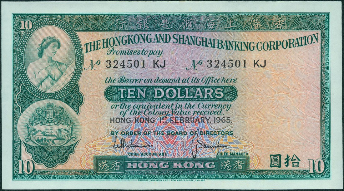 Hong Kong and Shanghai Banking Corporation, a group of $10 notes (33), 1 Feb 1965 (16), serial number 324501 KJ-324505 and 324528 KJ-324538, 27 Mar 1969 (17), 389284 NN-389300, green and multicoloured, maiden (Ceres ) and arms at left, two printed signatures below, reverse green, bank building at centre, angel above