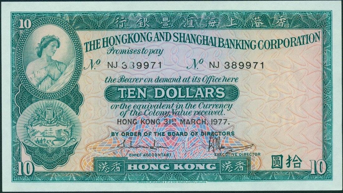 Hong Kong and Shanghai Banking Corporation, $10 (100), 31 Mar 1977, consecutive run of 100, serial number NJ 389901-390000, green and multicoloured, maiden (Ceres) and arms at left, two printed signatures below, reverse green, bank building at centre, angel above