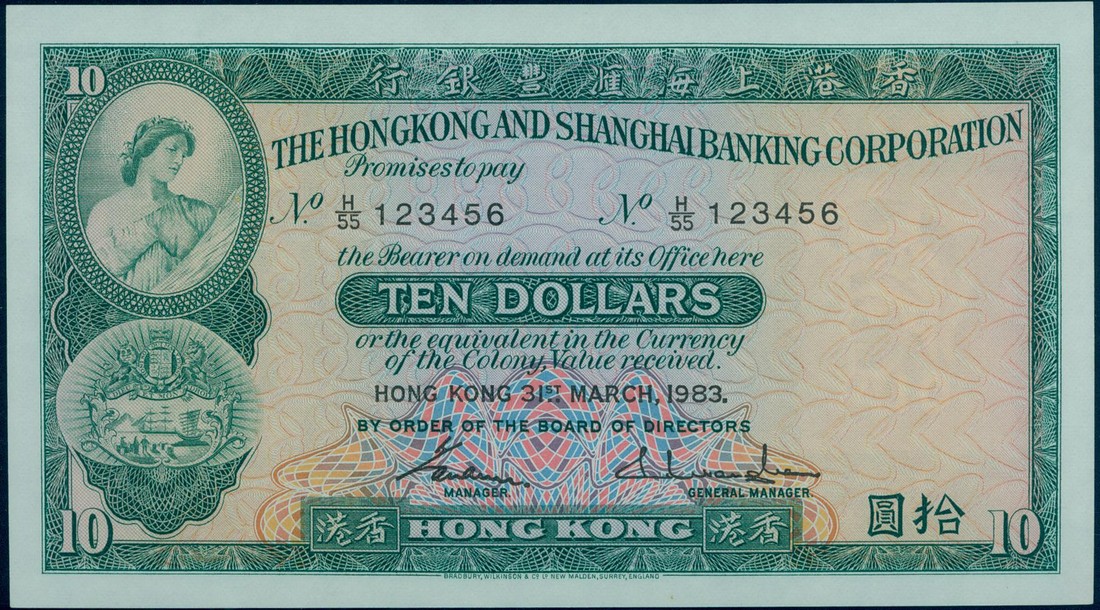 Hong Kong and Shanghai Banking Corporation, $10 (100), 31 Mar 1983, ascending ladder serial number H/55 123456, green and multicoloured, maiden (Ceres) and arms at left, two printed signatures below, reverse green, bank building at centre, angel above