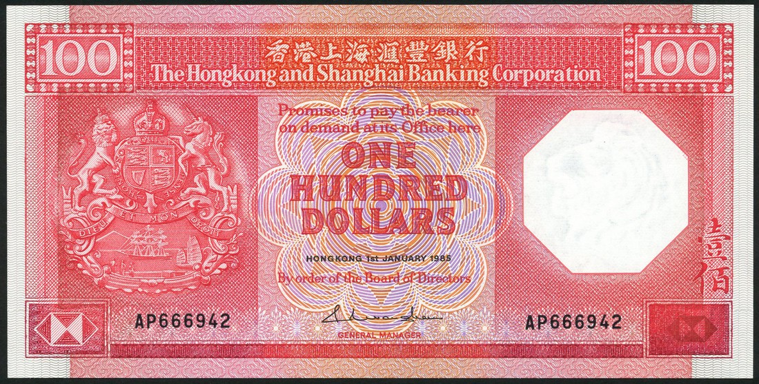 Hong Kong and Shanghai Banking Corporation, $10, 1985, $50, 1985,$100,1985 (Pick 191a,193a,194a), uncirculated (3)