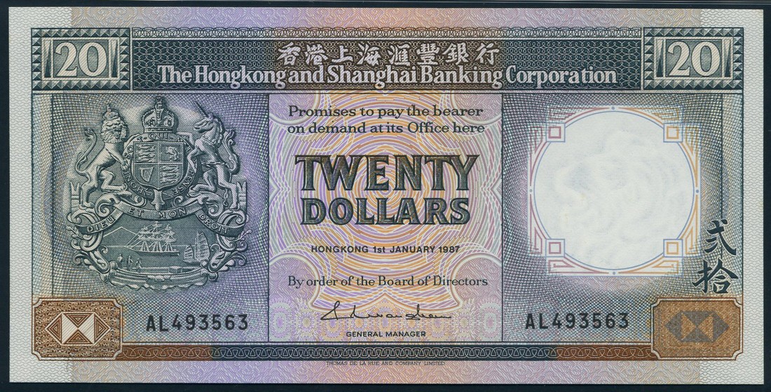 Hong Kong and Shanghai Banking Corporation, $20 (2), 1987, prefix AL, blue-grey and $50, 1985, prefix AA, violet, both arms at left