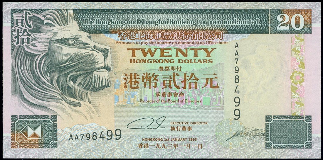 Hong Kong and Shanghai Banking Corporation, $20 (2), 1 January 1993, serial numbers AA798499-500, grey/green, lion on left, Victoria Harbour at centre, reverse green and brown with two lions flanking the HSBC bank building at centre and Star Ferry at left, both notes are error notes with a slight inking error on one of lions giving it red stripe,