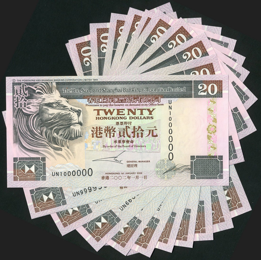 Hong Kong and Shanghai Banking Corporation, $20 (11), 1 January 2002, serial number UN 000001, UN 111111/222222/333333/444444/555555/666666/777777/888888/999999/1000000, 1 July 1930, serial number B281949, grey and lilac, lion at left, view of Hong Kong at centre, reverse multicoloured, bank buiding with lion at left and right