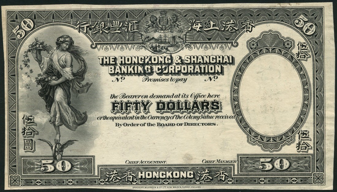 Hong Kong and Shanghai Banking Corporation, obverse and reverse die proof for a $50, Hong Kong, ND (c.1927), black and white, maiden at left on winged wheel (Communication), arms top centre, reverse black and white, bank building and angel