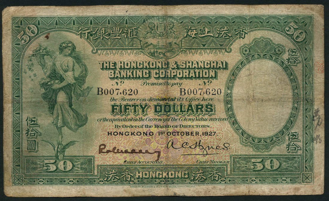 Hong Kong and Shanghai Banking Corporation, $50, 1 October 1927, serial number B 007620, green, orange and lilac, maiden on winged wheel at left (Communication), arms top centre, manuscript signature low left, printed signature of Hynes at right, reverse green and multicoloured, bank building at centre, winged angel above