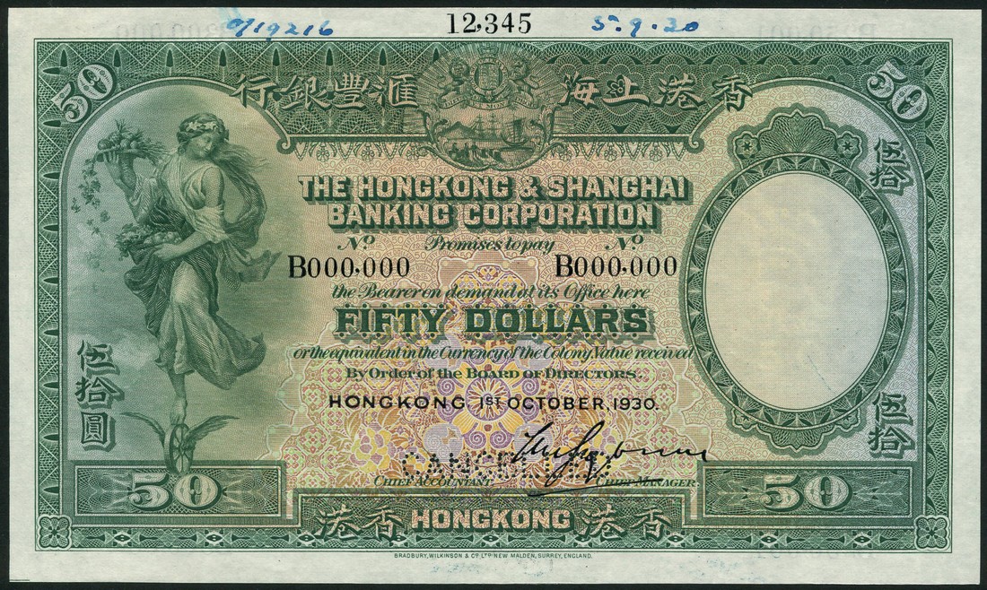 Hong Kong and Shanghai Banking Corporation, specimen $50, 1 October 1930, serial number B 000000, green and multicoloured, maiden on winged wheel at left (Communication), arms top centre, value at centre and at each corner, printed signature of V.M.Grayburn low right, reverse green and lilac, bank building and angel at centre, value at left and right