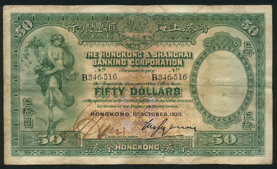 Hong Kong and Shanghai Banking Corporation, $50, 1 October 1930, serial number B 346516, green, orange and lilac, maiden on winged wheel at left (Communication), arms top centre, manuscript signature low left, printed signature of Grayburn low right, reverse green and multicoloured, bank building at centre, winged angel above