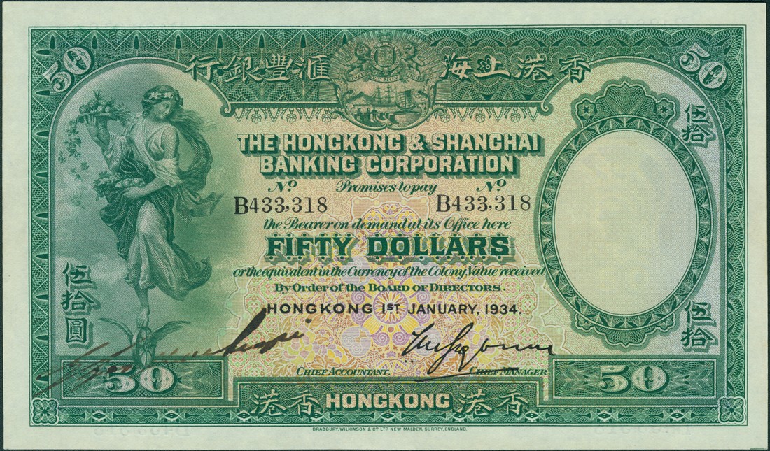 Hong Kong and Shanghai Banking Corporation, $50, 1 January 1934, serial number B 433318, green and pale orange and lilac, maiden on winged wheel at left (Communication), arms top centre, manuscript signature low left, printed signature of Vandeleur Grayburn, reverse green and lilac, bank building and angel at centre, value at each corner