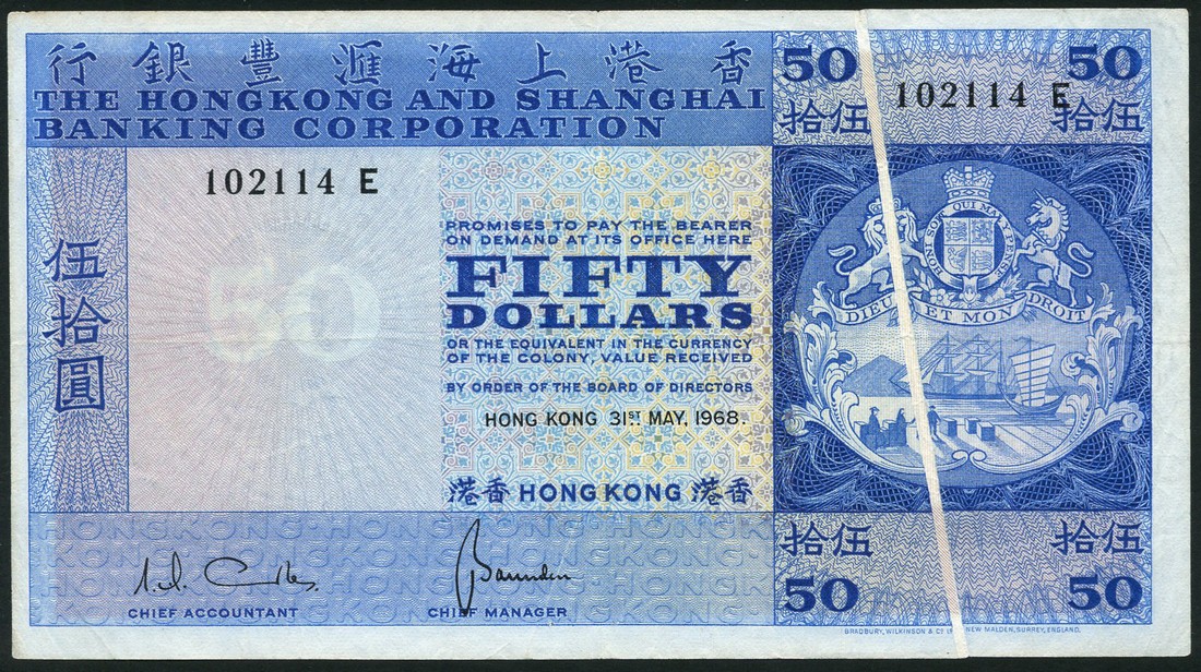 Hong Kong and Shanghai Banking Corporation, $50, 31 May 1968, serial number 102114E, blue and multicoloured, arms at right