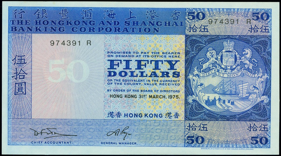 Hong Kong and Shanghai Banking Corporation, $50, 31 March 1975, serial numbers 974391-392 R, blue and multicoloured, coat of arms at right, watermark of a helmeted warrior at left, reverse blue with bank building at left