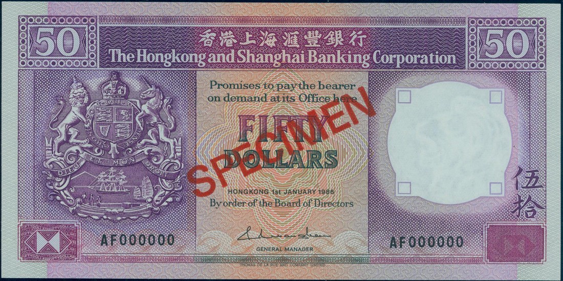 Hong Kong and Shanghai Banking Corporation, specimen $50, 1 January 1985, serial number AF 000000, purple and multicoloured, arms at left, printed signature below, reverse purple, bank building at centre, men on boats at right