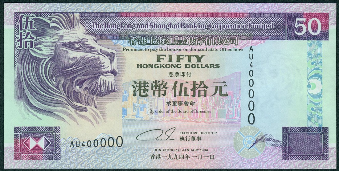 Hong Kong and Shanghai Banking Corporation, $50 (3), 1 Jan 1994, serial number AU 400000, 900000 and BD400000, purple and multicoloured, lion head at left, printed signature below, reverse purple, bank building at centre, dragon boats at right