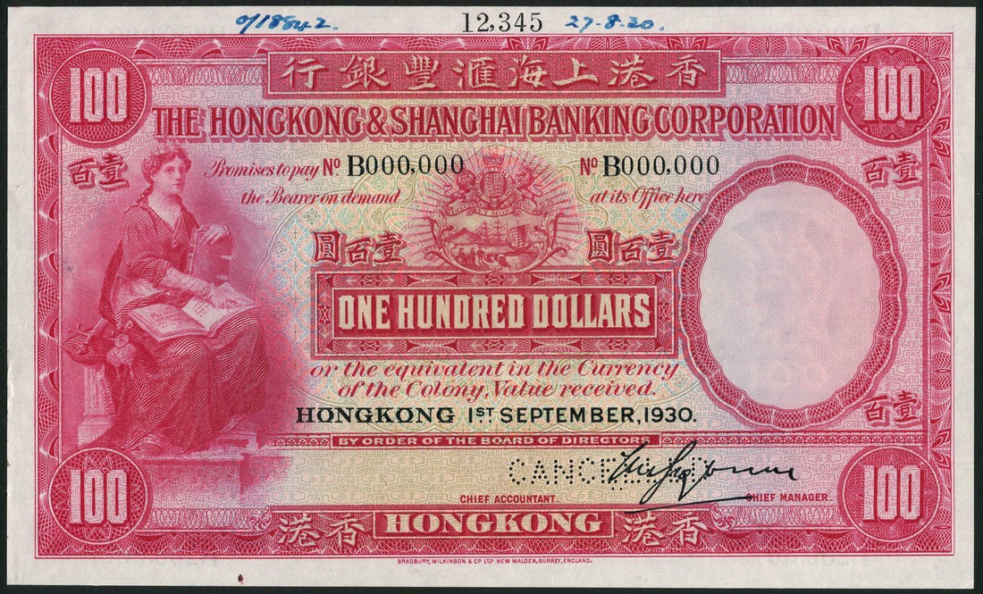 Hong Kong and Shanghai Banking Corporation, specimen $100, 1 September 1930, serial number B 000000, red and multicoloured, maiden at left with book and sword (Justitia), arms top centre, value at centre and at each corner, printed signature of V.M.Grayburn low right, reverse red, pale green and pink, bank building and angel at centre, value at left and right