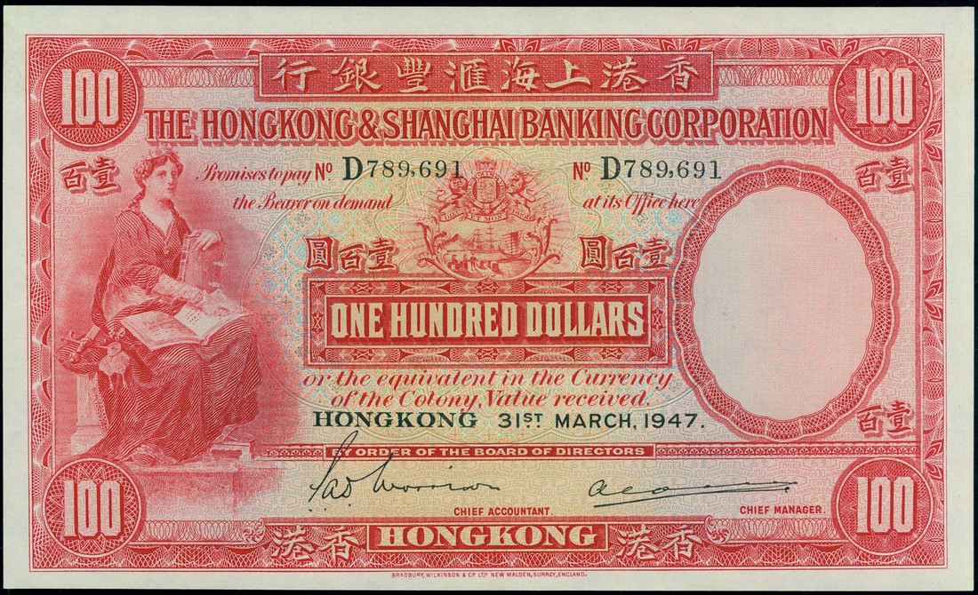 Hong Kong & Shanghai Banking Corporation, $100, 31 March 1947, serial number D789691, red on multicoloured underprint, maiden at left, arms at top centre, value at centre and each corner