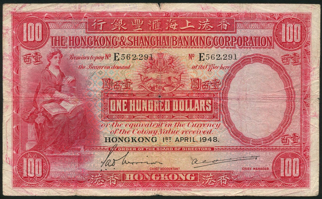 Hong Kong & Shanghai Banking Corporation, $100, 1 April 1948, serial number E 562, 291, red & multicoloured, woman seated at left with book, arms top centre, value at each corner