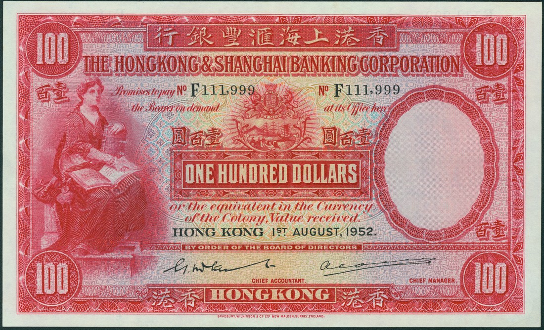 Hong Kong and Shanghai Banking Corporation, $100, 1 August 1952, serial number F 111999, red and multicoloured, maiden at left with book and sword (Justitia), arms at centre, value at centre and at each corner, two printed signatures below, reverse red and multicoloured, bank building at centre, angel above, value and serial number at each corner