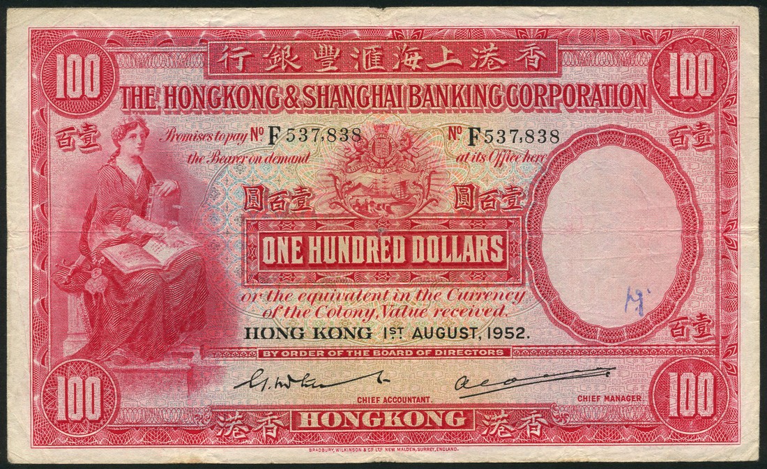 Hong Kong & Shanghai Banking Corporation $100, 1 August 1952, serial number F 537,838, red & multicoloured, woman seated at left with book, arms top centre, value at each corner