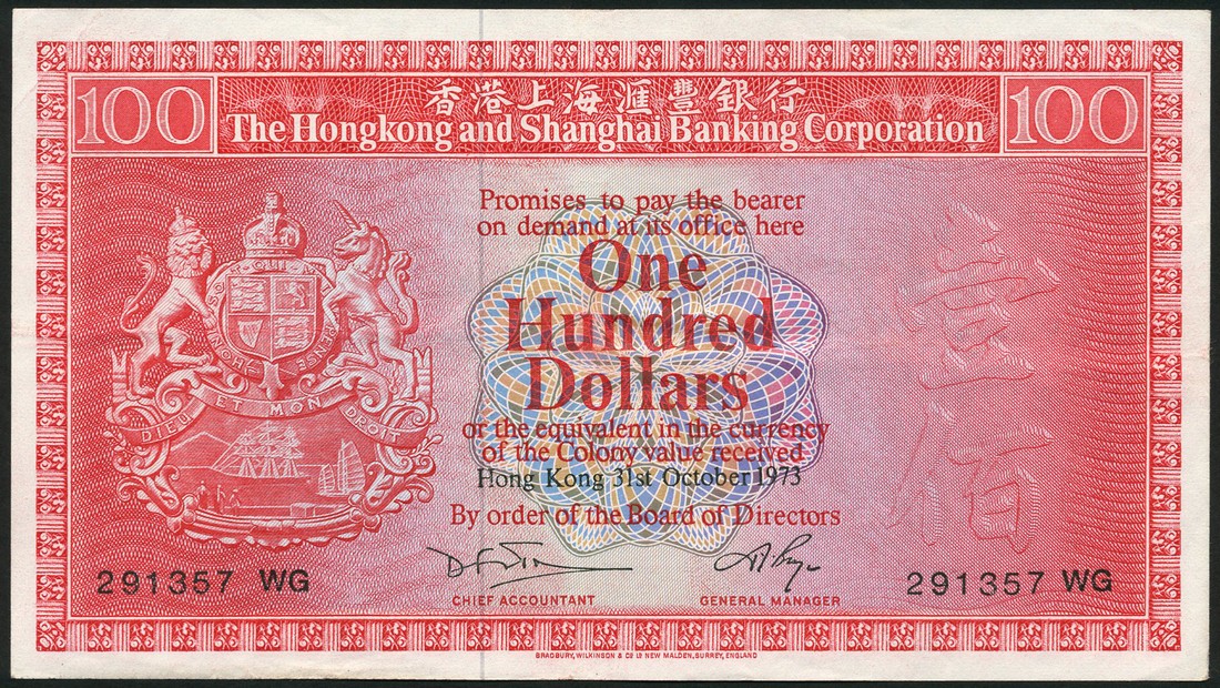 Hong Kong and Shanghai Banking Corporation, $100, 4 February 1959, prefix J, red, maiden at left (Justitia), arms at centre, two printed signatures below, also $100, 31 October 1973, red, arms at left