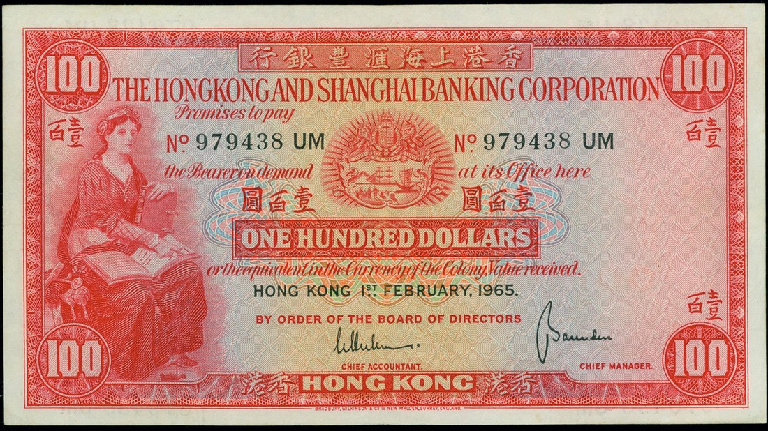 Hong Kong and Shanghai Banking Corporation, $100, 1 Feb 1965, serial number 979438 UM, red, woman with book at left, coat of arms at centre, reverse red, bank building at centre, error note with one of serial numbers on the back printed as 879438 UM