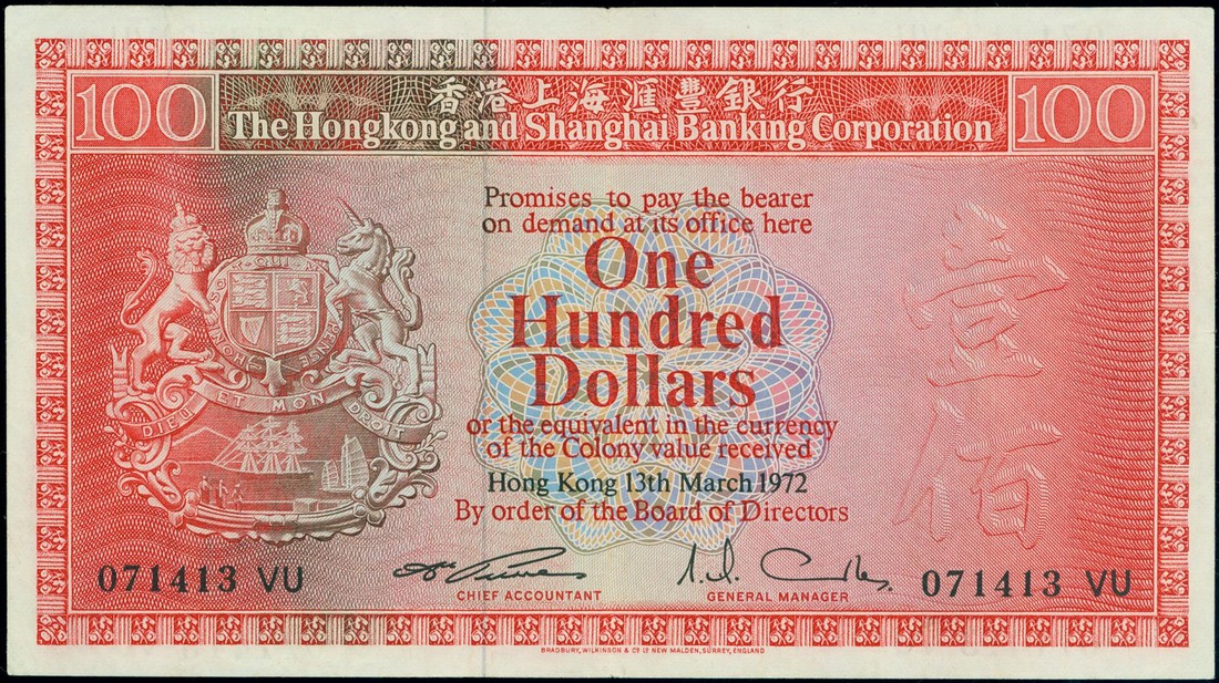 Hong Kong and Shanghai Banking Corporation, $100, 13 March 1972, thick serial number 071413 VU, red, coat of arms at left, 'one hundred' in Chinese characters at right, reverse red and green, two lions flanking HSBC building, an error note with traces of green on left side of the obverse,