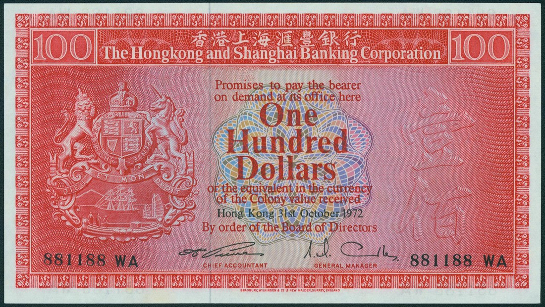 Hong Kong and Shanghai Banking Corporation, $100 (2), 31 Oct 1972, serial number 009999 WE,881188 WA, red and multicoloured, arms at left, two printed signatures below, reverse red, bank head office at centre,