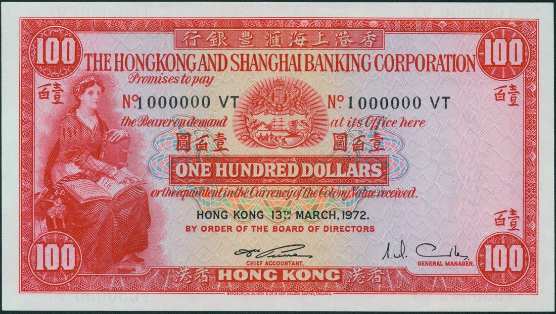 Hong Kong and Shanghai Banking Corporation, $100, 13 Mar 1972, serial number 1000000 VT, red and multicoloured, maiden (Justitia) seated at left, arms top centre, two printed signatures below, reverse red, bank head office at centre, angel above, last note of the issue and $100, 31 Mar 1982, serial number VT 1000000, red and multicoloured, arms at left, two printed signatures below, reverse red, bank head office at centre, last serial number