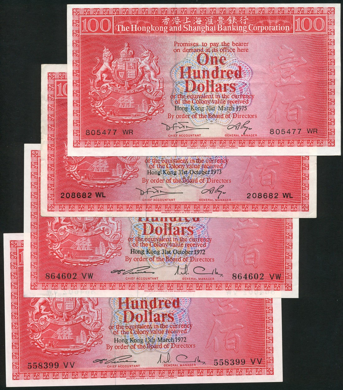 Hong Kong and Shanghai Banking Corporation, $100 (4), 1972 (2), 1973,1975, red and multicoloured, arms at left