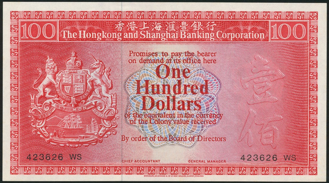 Hong Kong and Shanghai Banking Corporation, 100 dollars, serial number 423626WS, no date, no signatures, red on multicolour underprint, arms at left,