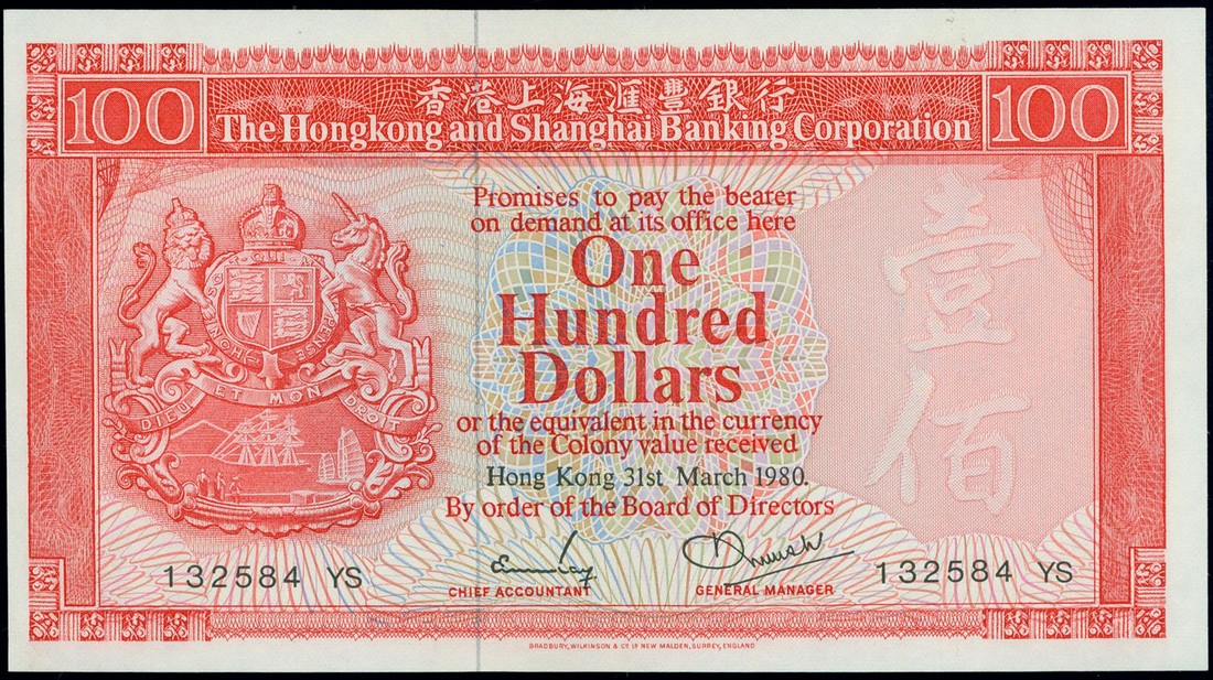 Hong Kong & Shanghai Banking Corporation, $100, 31 March 1980, serial number 132584 YS, red on multicolour underprint, arms at left, value at centre and top corners