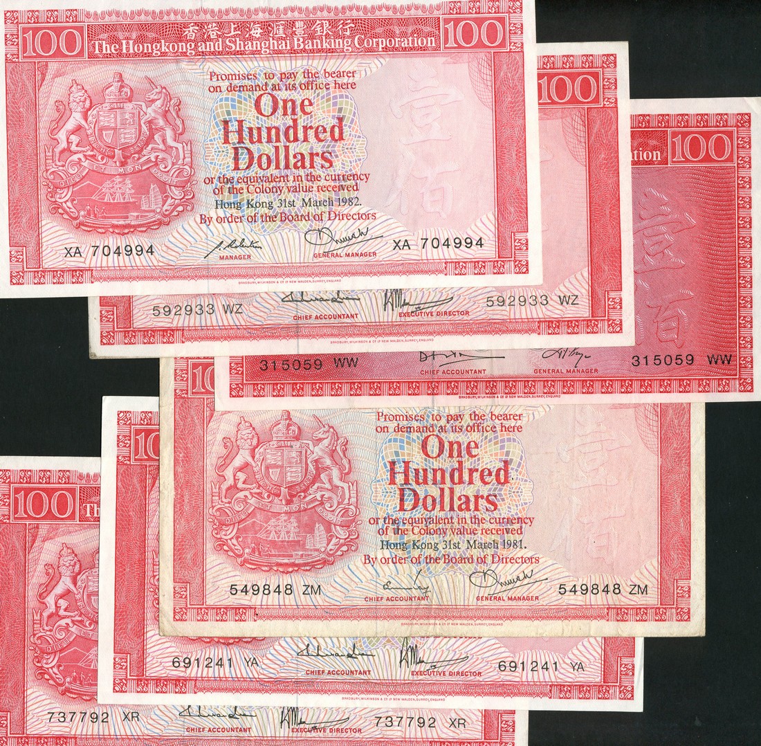 Hong Kong and Shanghai Banking Corporation, $100 (6), 1976,1977,1978,1979,1981,1982, red and multicoloured, arms at left