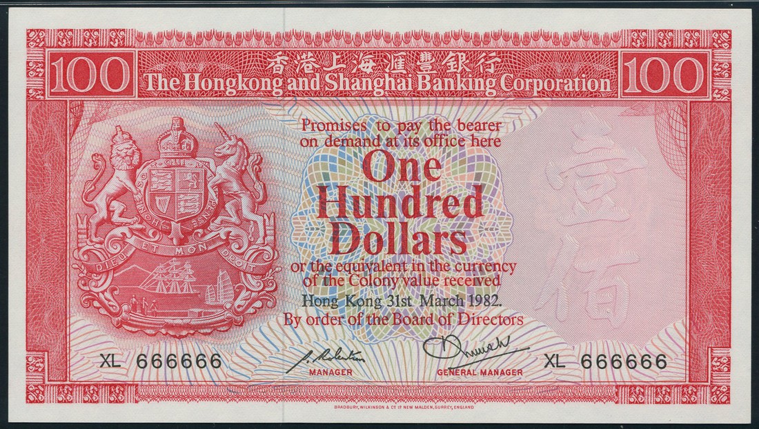 Hong Kong and Shanghai Banking Corporation, $100, 31 March 1982, serial number XL 666666, red and multicoloured, arms at left, reverse red, bank building at centre