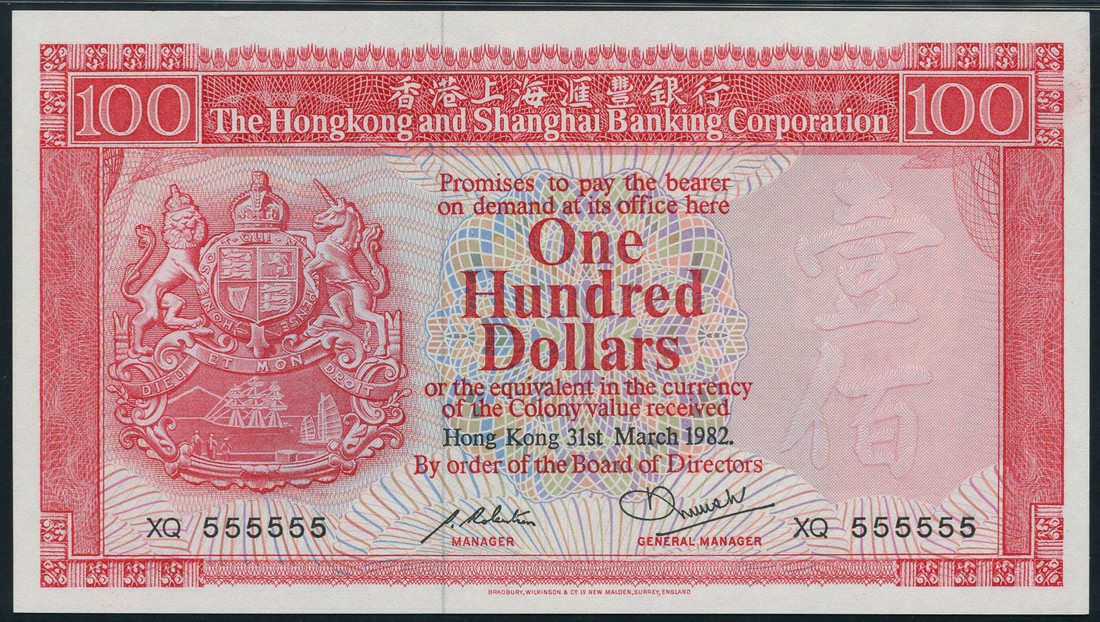 Hong Kong and Shanghai Banking Corporation, $100, 31 March 1982, serial number XQ 555555, red and multicoloured, arms at left, reverse red, bank building at centre