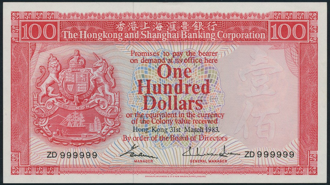 Hong Kong and Shanghai Banking Corporation, 100 dollars, 1983, serial number ZD999999, red on multicolour underprint, arms at left,