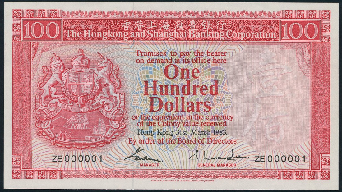 Hong Kong and Shanghai Banking Corporation, 100 dollars, 1983, serial number ZE000001, red on multicolour underprint, arms at left