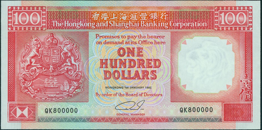 Hong Kong and Shanghai Banking Corporation, $100, 1 Jan 1992, serial number QK 800000, red and multicoloured, arms at left, printed signature below, reverse red, bank building at centre, pagoda at right