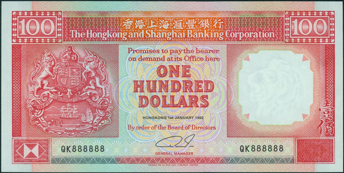 Hong Kong and Shanghai Banking Corporation, $100, 1 Jan 1992, serial number QK 888888, red and multicoloured, arms at left, printed signature below, reverse red, bank building at centre, pagoda at right