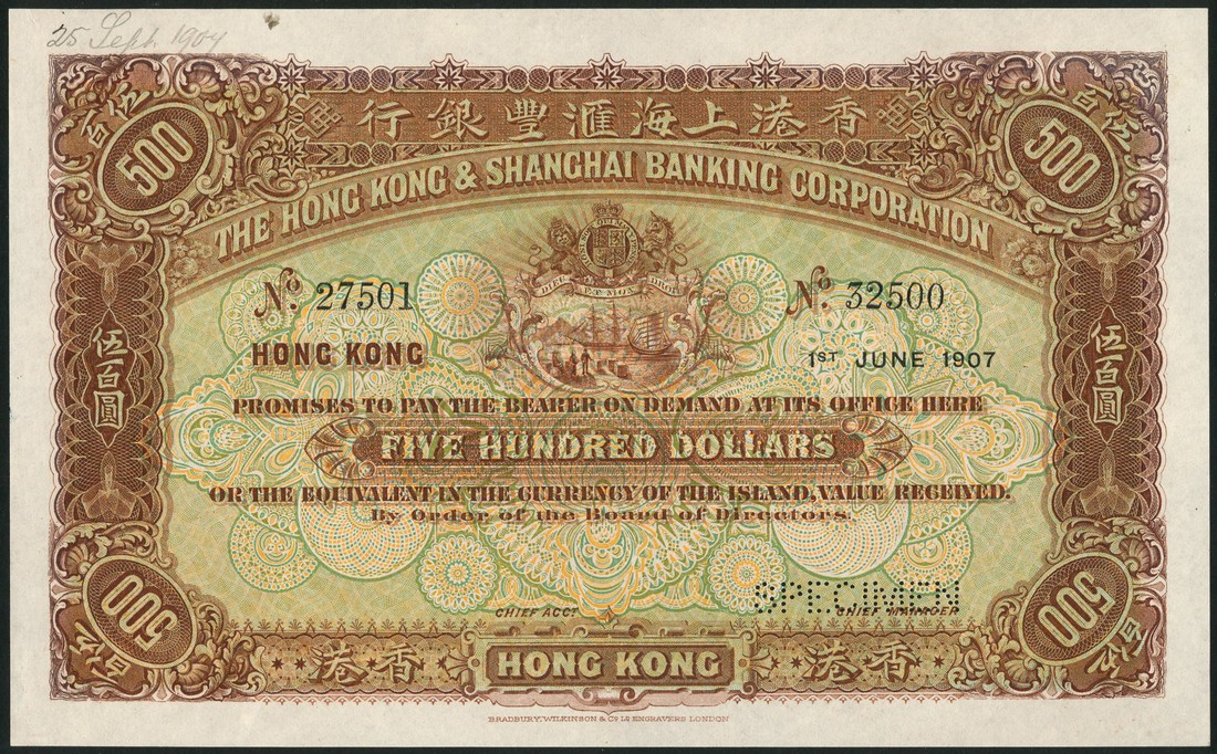 Hong Kong and Shanghai Banking Corporation, specimen $500, 1 June 1907, serial number 27501-32500, brown, green and orange with an ornate central panel, arms of the Bank top centre, value in brown underprint low centre, value at each corner, bank title in curve top centre, reverse red and white, allegorical maiden (Industry) and three cherubs at centre, value at each corner