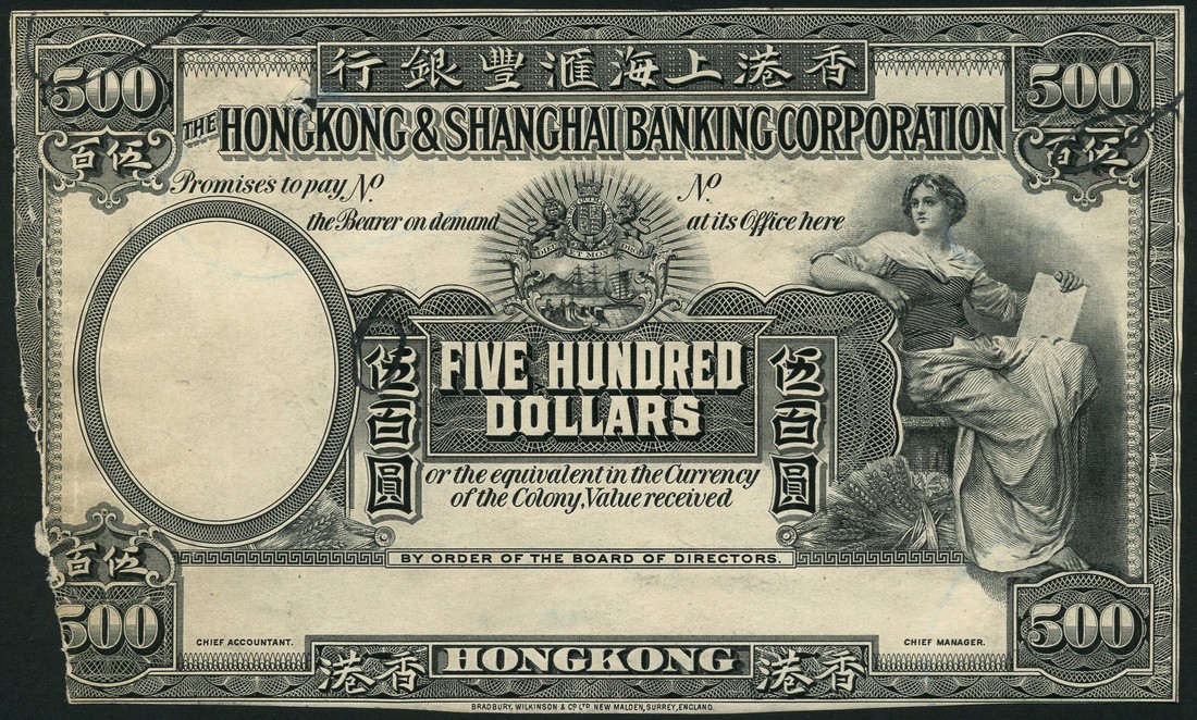 Hong Kong and Shanghai Banking Corporation, obverse and reverse die proof for a $500, type of 1927, black and white, maiden at right, arms, reverse purple, bank building and angel at centre