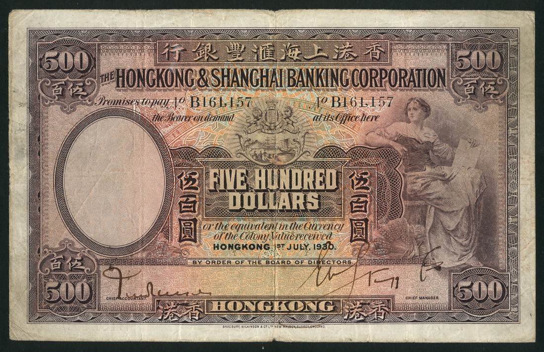 Hong Kong and Shanghai Banking Corporation, $500, 1 July 1930, serial number B 161157, purple and multicoloured, maiden at right, arms at top centre, value at centre and at each corner, two manuscript signatures below, reverse purple and multicoloured, bank building at centre, angel above, value at left and at each corner