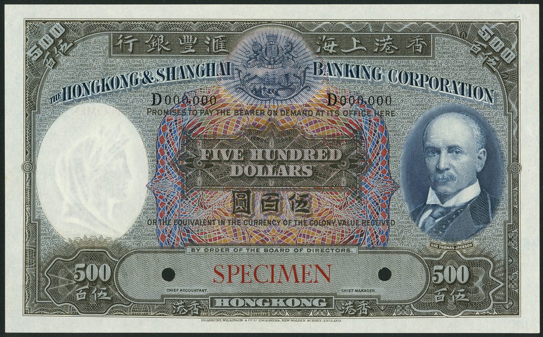 Hong Kong and Shanghai Banking Corporation, colour trial $500, ND (type of 1935), serial number D 000000, olive-green and blue, and multicoloured, Sir Thomas Jackson at right, arms top centre, reverse green, bank head office at centre, veiled head of Ceres at left,