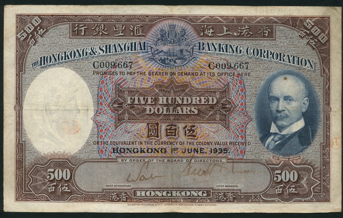Hong Kong and Shanghai Banking Corporation, $500, 1 June 1935, serial number C 009667, purple-brown and blue, Sir Thomas Jackson at right, arms top centre, two manuscript signatures below, reverse blue and white, bank head office at centre, bust of Ceres at left