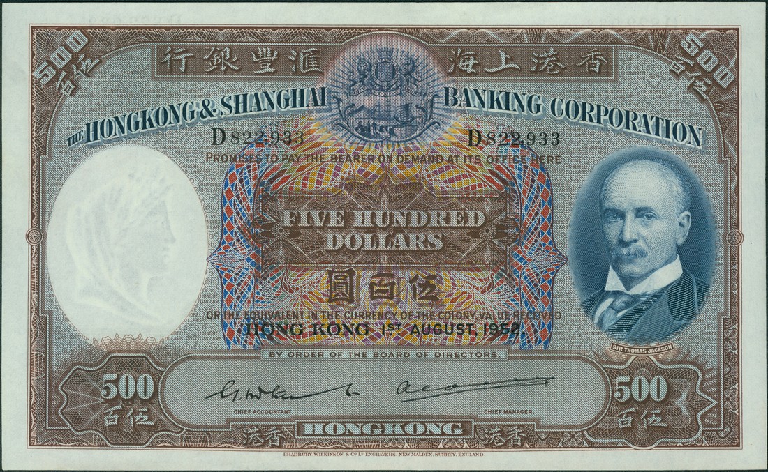 Hong Kong and Shanghai Banking Corporation, $500, 1 August 1952, serial number D 822933, brown and multicoloured, Sir Thomas Jackson at right, arms at centre, value at centre and at each corner, two printed signatures below, reverse blue and white, bank building at centre, female head (Ceres) veiled at left, value at each corner