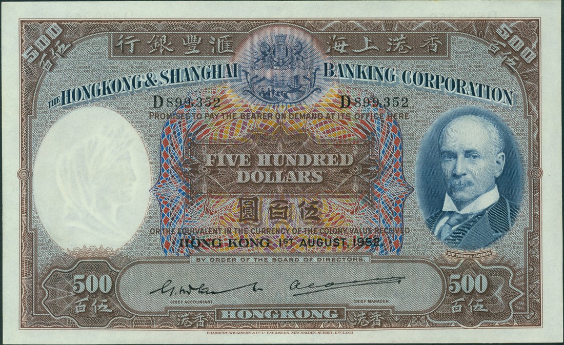 Hong Kong and Shanghai Banking Corporation, $500, 1 August 1952, serial number D 898352, brown and multicoloured, Sir Thomas Jackson at right, arms at centre, value at centre and at each corner, two printed signatures below, reverse blue and white, bank building at centre, female head (Ceres) veiled at left, value at each corner