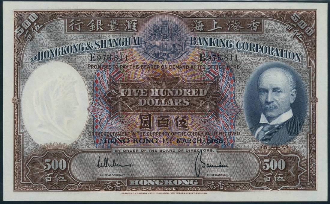 Hong Kong and Shanghai Banking Corporation, $500, 31 July 1967, serial number E 976811, purple and multicoloured, Sir Thomas Jackson at right, arms top centre, two printed signatures below, reverse blue, bank building at centre, veiled head of Ceres at left,